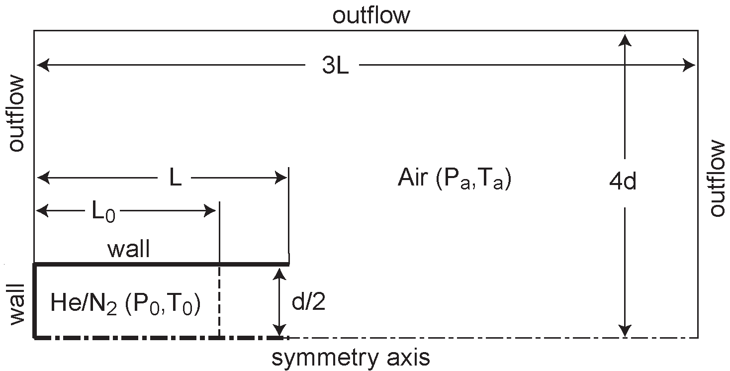We performed numerical studies of a shock tube with an open end to investigate the impulse due to the exhaust of gases through the open end of the tube as a model for a partially-filled detonation tube as used in pulse detonation engine testing. The simulaion model is shown in the following. The driver section was filled with pressurized gas (helium or nitrogen) and the driven section was open to the atmosphere. The initial conditions in the driven section matched those of the room, nominally 22 C and Pa = 99 kPa. In the driver section, the initial temperature was also room temperature, but the initial pressure was varied from P0 = 929 kPa (P0/Pa = 9.38) to P0 = 198 KPa (P0/Pa = 2.0). The length of the driver section, L0 = 101.6 mm, the total tube legth L = 0-1.84 m, the tube diameter d0 = 39.5 mm. The fill fraction,
