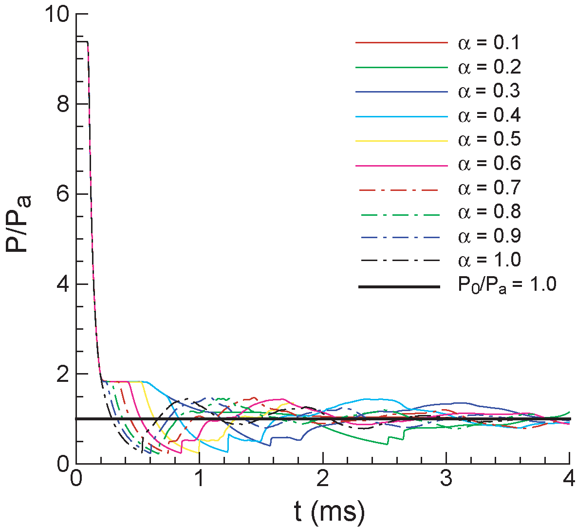 We performed numerical studies of a shock tube with an open end to investigate the impulse due to the exhaust of gases through the open end of the tube as a model for a partially-filled detonation tube as used in pulse detonation engine testing. The simulaion model is shown in the following. The driver section was filled with pressurized gas (helium or nitrogen) and the driven section was open to the atmosphere. The initial conditions in the driven section matched those of the room, nominally 22 C and Pa = 99 kPa. In the driver section, the initial temperature was also room temperature, but the initial pressure was varied from P0 = 929 kPa (P0/Pa = 9.38) to P0 = 198 KPa (P0/Pa = 2.0). The length of the driver section, L0 = 101.6 mm, the total tube legth L = 0-1.84 m, the tube diameter d0 = 39.5 mm. The fill fraction,